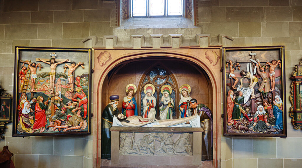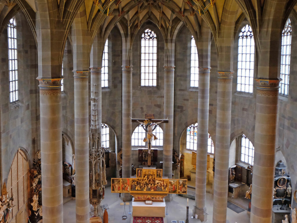 Herausragende Werke der spätgotischen Kunst im Inneren der Kirche sind der niederländische Passionsaltar im Chor – 1460, das überlebensgroße Kruzifix des Ulmer Bildhauers Michel Erhart – 1494, die filigrane Steinmetzarbeit des figurenreichen Sakramentshauses – 1438 und das Heilige Grab mit seinen eindrucksvollen Trauergestalten – 1455/ 56.